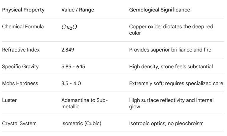 The physical characteristics of cuprite are defined by several remarkable optical properties. It possesses a high density, with a specific gravity ranging from 5.85 to 6.15, making it significantly heavier than most common gemstones. Furthermore, its refractive index (RI) is measured at 2.849, a value that exceeds even that of a diamond (2.417). This high RI, coupled with an adamantine to sub-metallic luster, provides cuprite with a level of brilliance and internal "fire" that is mathematically superior to almost any other natural material.